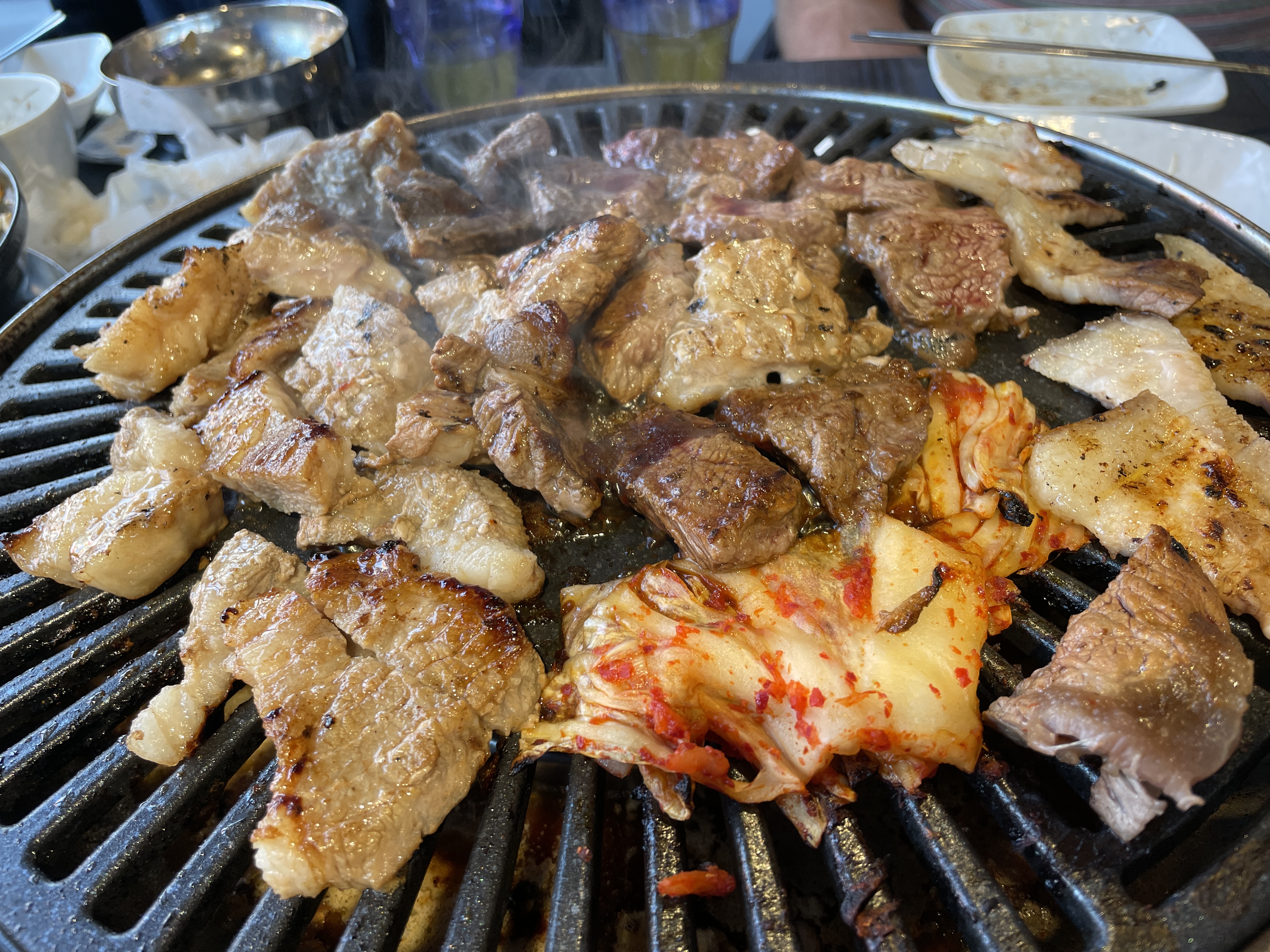 끝나고 집에 오는 길에 고기집에 가서 고기를 실컷 먹었어요.